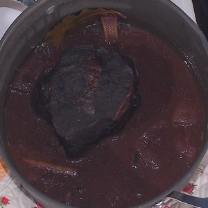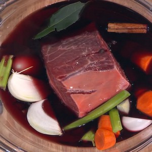 Pour la viande braisée : Coupez le céleri, les carottes et l’oignon en petits morceaux. Dans un bol, mettez les légumes hachés, le chapeau de prêtre, les épices, la feuille de laurier et recouvrez de vin rouge. Laissez-le mariner au réfrigérateur pendant la nuit.