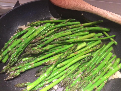 Faites cuire l’échalote à feu doux pour éviter qu’elle ne brûle et une fois bien flétrie, ajoutez les asperges, augmentez le feu et faites-les dorer quelques minutes en les aromatisant avec une pincée de sel.