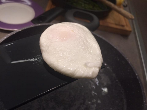 Après ce temps, égouttez l’œuf à l’aide d’une spatule ou d’une écumoire et placez-le très doucement sur une soucoupe.