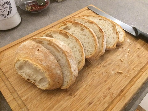 Commençons la préparation de la bruschetta aux asperges et à l’œuf poché en coupant le pain maison en tranches d’environ 1,5 cm d’épaisseur.