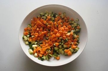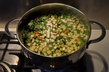 Portez l’eau à ébullition, ajoutez du sel et commencez à cuire les pois verts dedans. Après quelques minutes, ajoutez les courgettes et les carottes et faites cuire le tout.