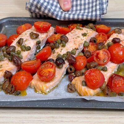 Versez les tomates cerises avec les câpres dans la poêle et faites cuire avec l’espadon pendant encore deux minutes. Si la sauce sèche trop pendant la cuisson, ajoutez un peu d’eau.