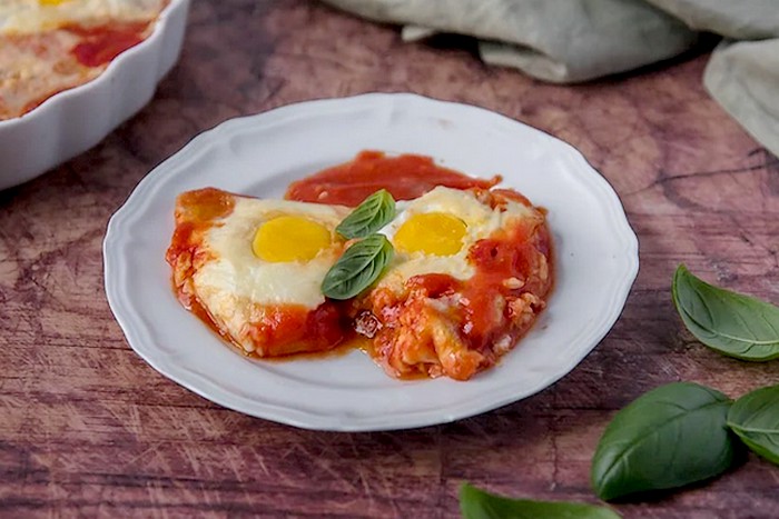 Complétez avec une pincée de sel sur les jaunes d’œufs, du fromage râpé et quelques feuilles de basilic. |