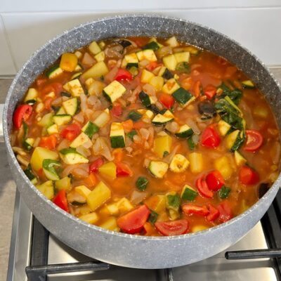 Faire revenir les légumes : dans la même cocotte, ajoutez l’oignon, les carottes et le céleri. Faites revenir à feu moyen pendant environ 5 minutes. Ajoutez l’ail et mélangez pendant 1 minute. |