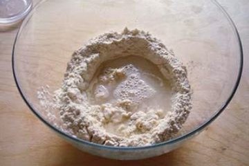 Tamisez la farine dans un grand bol et versez la levure et le sucre dissous dans une petite partie de l’eau au centre. Ajoutez progressivement l’autre eau et commencez à pétrir.
