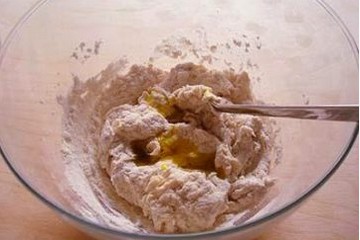 Ajoutez l’huile puis enfin le sel, pétrissez grossièrement, puis déplacez la pâte sur une planche farinée et pétrissez environ dix minutes.