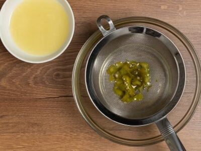 Laissez aller doucement pendant quelques minutes, en remuant avec une spatule, jusqu’à ce que le sucre soit complètement dissous et que vous obteniez un sirop onctueux. Éteignez le feu et laissez-le refroidir complètement. Filtrez ensuite le sirop pour retirer les pelures des agrumes et ajoutez le jus. |