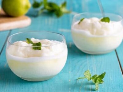 Fouettez le blanc d’œuf jusqu’à ce qu’il soit ferme et ajoutez-le aux liquides en effectuant des mouvements de bas en haut jusqu’à ce que le mélange soit homogène. Transférez-le dans un plateau puis au congélateur et laissez-le durcir pendant environ 4 heures en remuant toutes les demi-heures. (Alternativement, vous pouvez remuer le sorbet après la première demi-heure de repos, le laisser au congélateur pour le temps restant, puis le mélanger avec un mixeur plongeant avant de servir). |