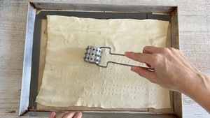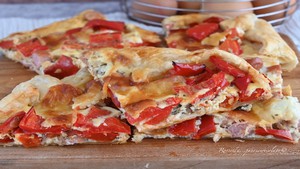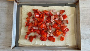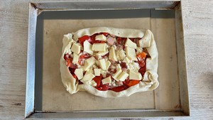Posez la feuille rectangulaire ou ronde sur une plaque à pâtisserie et piquez-la. Ajoutez les poivrons sautés à l’intérieur mais si vous les voulez plus croquants et surtout faites-le plus rapidement, laissez-les crus. Ajouter les saucisses de Francfort en petits morceaux.