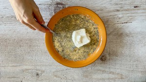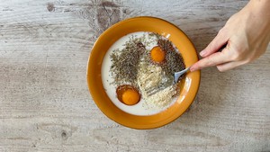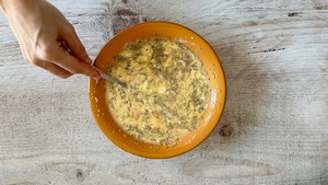 Mettez les œufs, le lait, l’origan, le sel dans un bol et mélangez le tout. Ajouter le fromage stracchino et mélanger à nouveau.