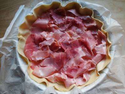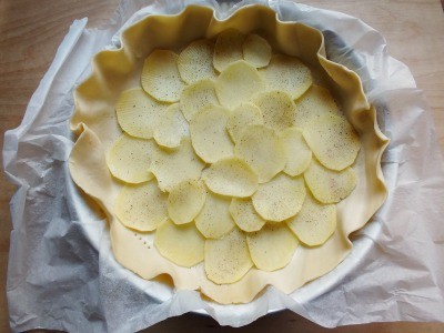 Déroulez le disque de pâte feuilletée en le maintenant sur la feuille de papier sulfurisé fournie dans l’emballage. Transférez-le dans un moule à cake et piquez le fond avec les dents d’une fourchette. |